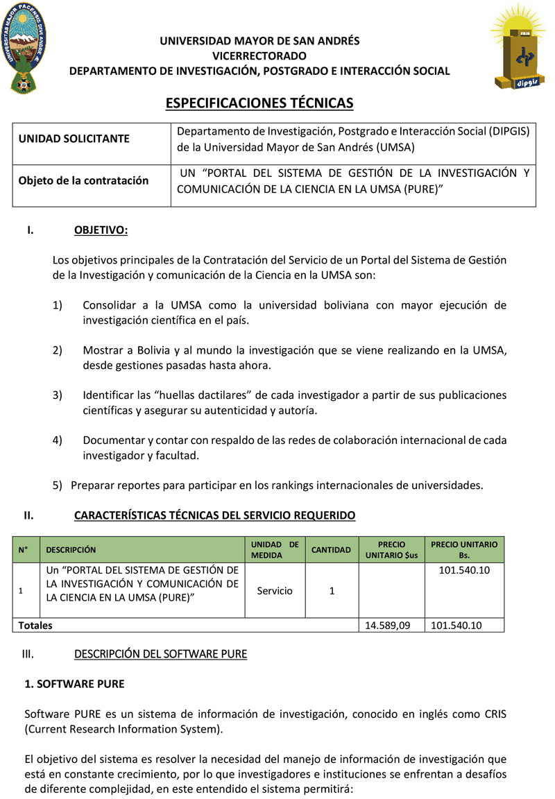 “PORTAL DEL SISTEMA DE GESTIÓN DE LA INVESTIGACIÓN Y COMUNICACIÓN DE LA CIENCIA EN LA UMSA (PURE)” (o su equivalente) (pdf)