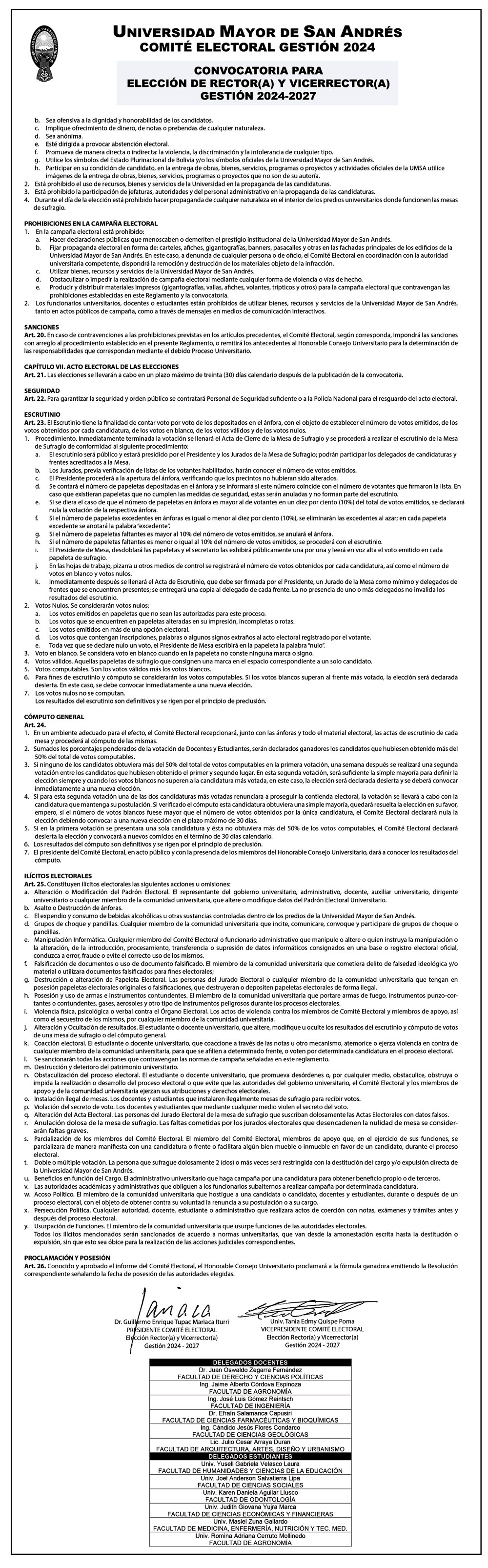ELECCIÓN RECTOR(A) Y VICERRECTOR GESTIÓN 2024-2027 UNIVERSIDAD MAYOR DE SAN ANDRÉS