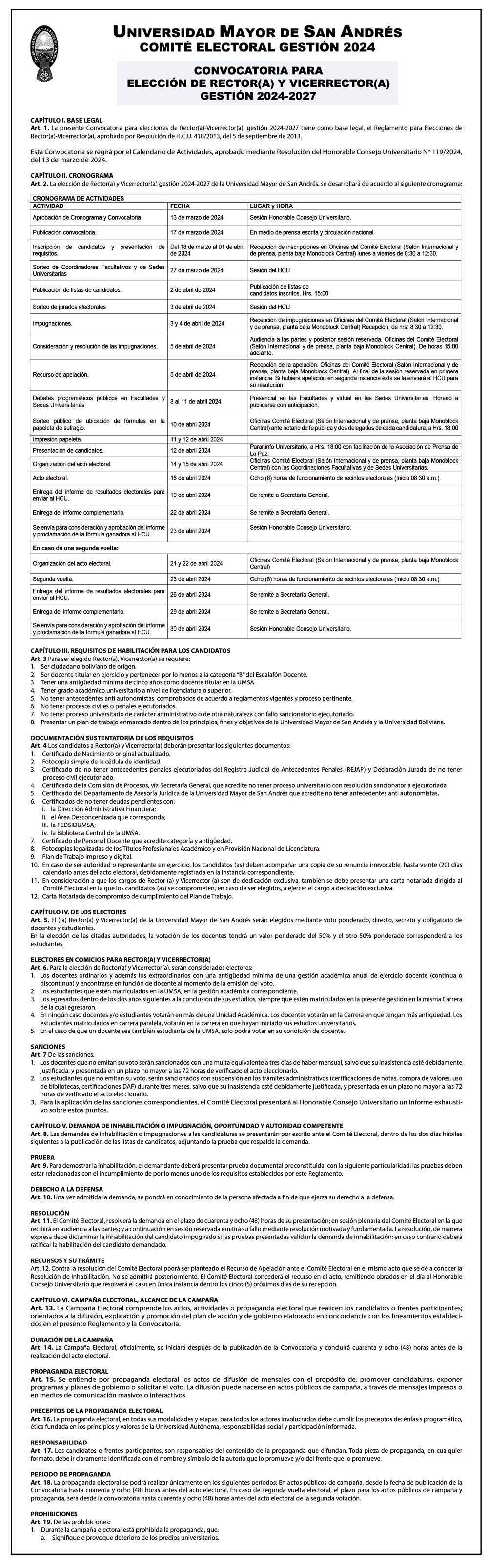 El Comité Electoral de la Universidad Mayor de San Andrés convoca a Elecciones para elegir a las nuevas autoridades de nuestra casa de estudios superiores: Rector(a) y Vicerrector(a), gestión 2024 – 2027. Fecha de la elección: Martes 16 de abril de 2024