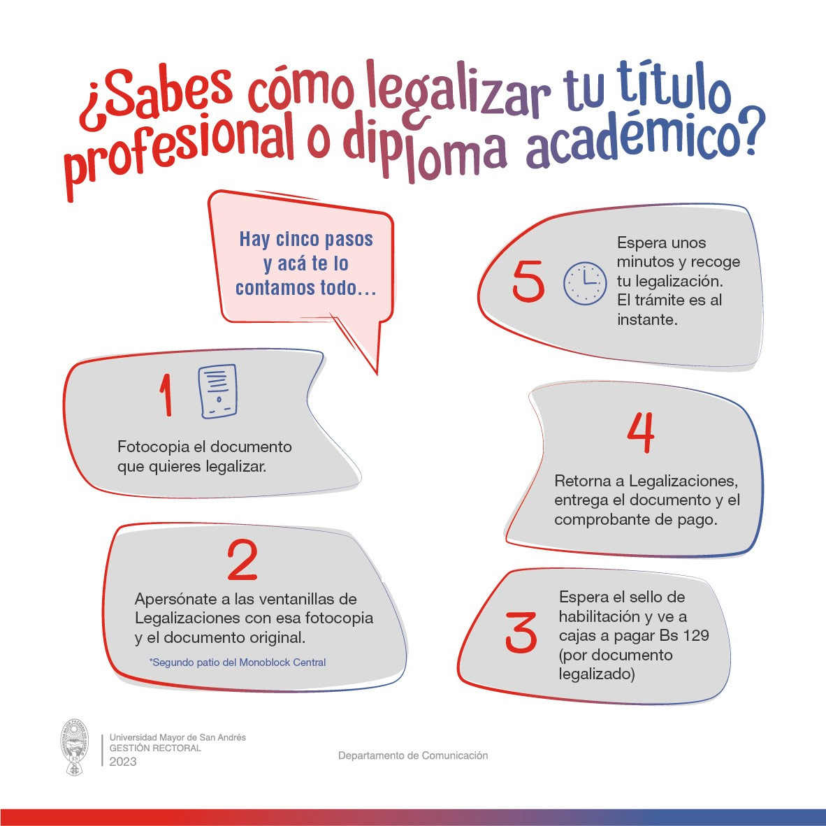 #UMSAsabíasQué | ¿Necesitas legalizar la copia de tu título profesional o tu diploma académico?, te enseñamos cómo hacerlo en cinco pasos.