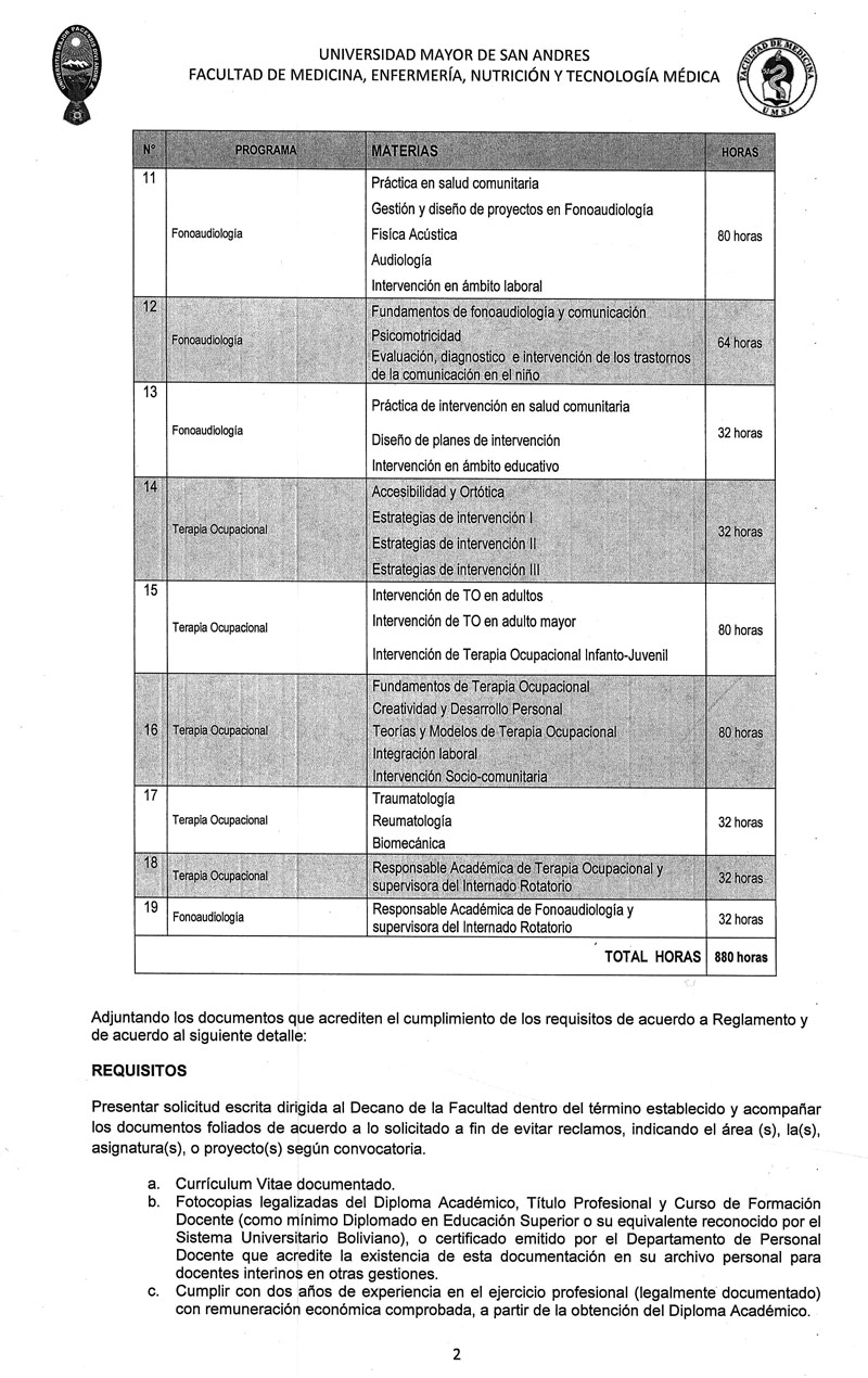 La Facultad de Medicina, Enfermería, Nutrición y Tecnología Médica sobre la base del Estatuto Orgánico de la Universidad Boliviana, Congreso Nacional de Universidades, Reglamento para la Elaboración de Convocatorias Académicas de Docentes Contratados e Interinos, la Resolución del Honorable Consejo Facultativo N° 0811/2021 invita a los señores profesionales nacionales o extranjeros con conocimiento y experiencia en la(s) asignatura(s) o área(s) a las que postula y que cuenten con Diploma Académico y Título Profesional (para extranjeros con residencia legal y documentación convalidada reglamentariamente), a participar del Concurso de Méritos
