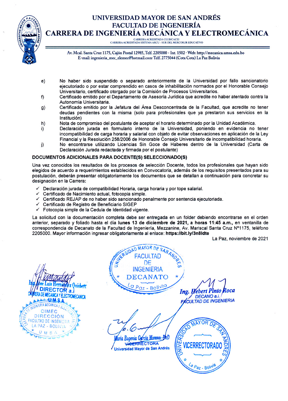 La Facultad de Ingeniería sobre la base del Estatuto Orgánico de la Universidad Boliviana, Congreso Nacional de Universidades, Reglamento para la elaboración de Convocatorias Académicas de Docentes Contratados e Interinos, la Resolución de Honorable Consejo Facultativo Virtual N° 1146/2021, invita a los señores profesionales nacionales o extranjeros con conocimiento y experiencia en la(s) asignaturas(s) o área(s) a las que postula y que cuenten con Diploma Académico y Título Profesional (para extranjeros con residencia legal y documentación convalidada reglamentariamente), a participar del Concurso de Méritos.