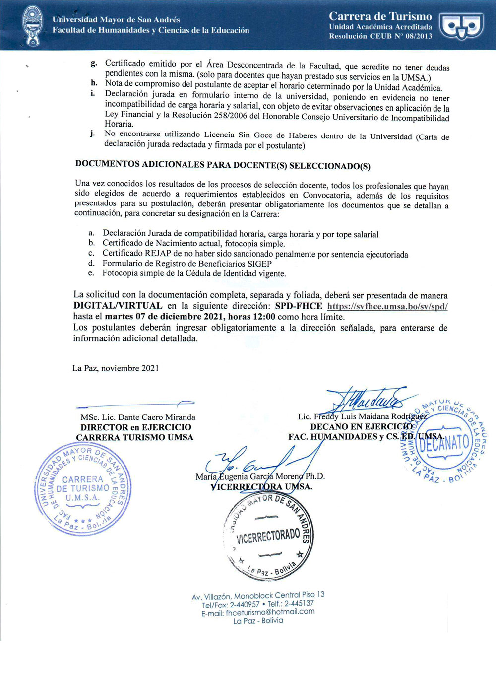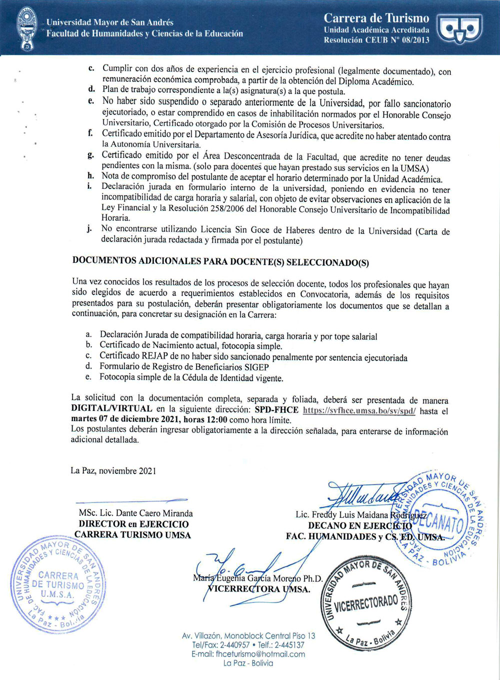 CONVOCATORIA PÚBLICA No. 011/2021 CONCURSO DE MERITOS PARA DOCENTES INTERINOS, GESTIÓN 2022 - CARRERA DE TURISMO
