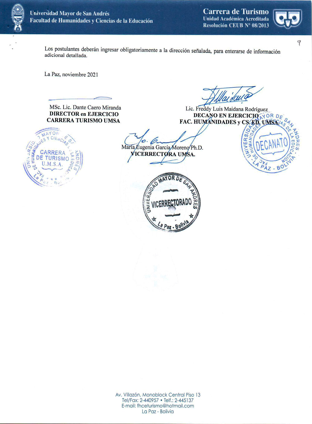 CONVOCATORIA PÚBLICA No. 012/2021 CONCURSO DE MÉRITOS PARA DOCENTES INTERINOS GESTIÓN 2022 - CARRERA DE TURISMO